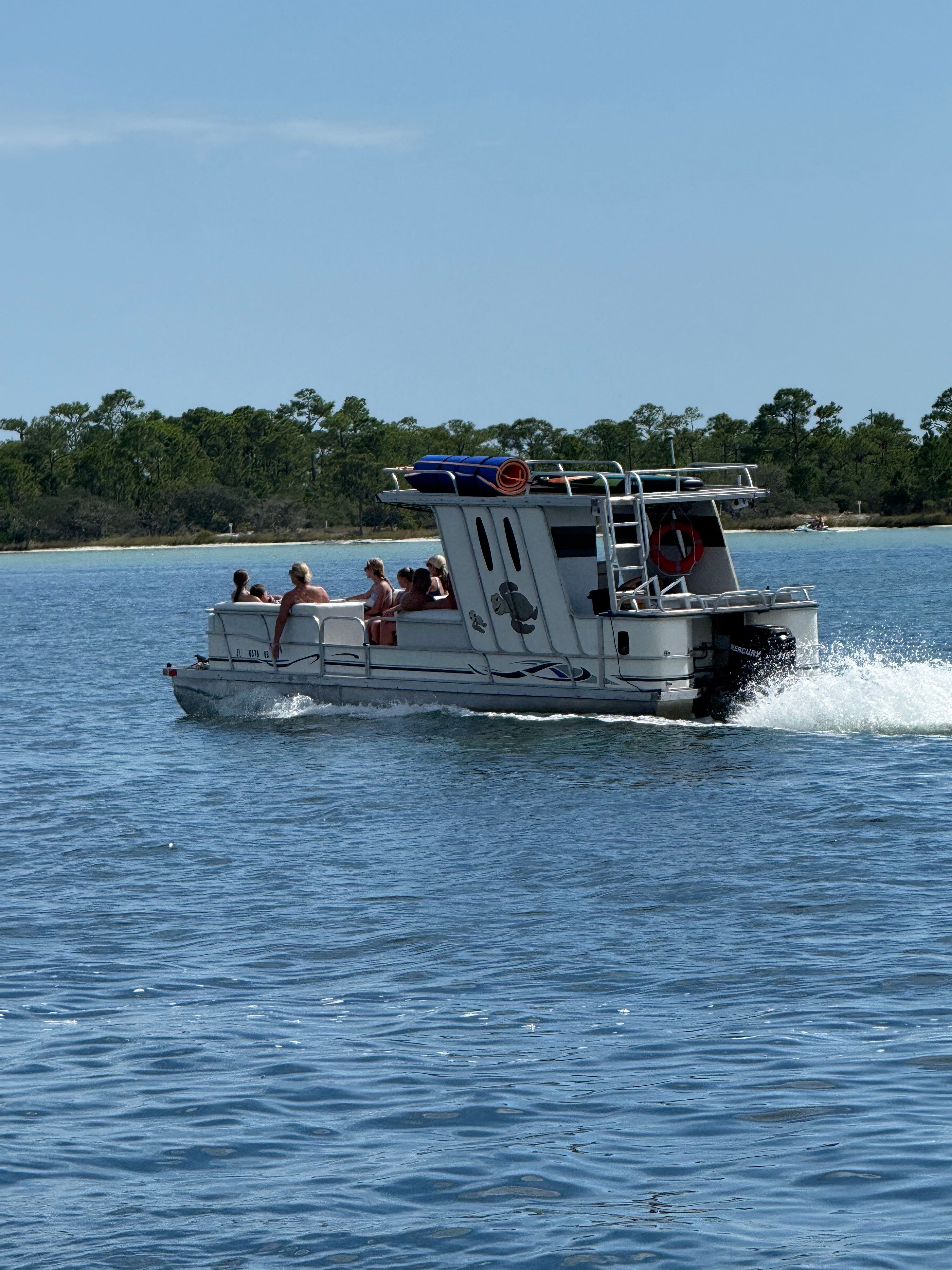 The 30-foot PlayCraft tritoon is built for comfort and stability, making it a customer favorite for extended trips like this one. Those three pontoons give you a rock-solid platform that doesn't bounce around like smaller boats, which makes all the difference when you're spending nine hours on the water. The onboard bathroom is a game-changer for longer trips – no need to cut your adventure short or feel uncomfortable. Captain Ron keeps all the required safety equipment on board, so you don't need to worry about bringing anything except sunscreen and a good attitude. The Mercury engine gives us plenty of power to cover serious ground, meaning we can hit multiple spots throughout the day and still have time to really enjoy each one. This setup works year-round, so whether you're planning a summer celebration or a winter escape, the conditions stay comfortable and safe.